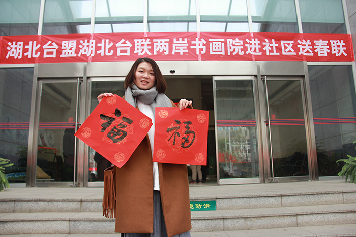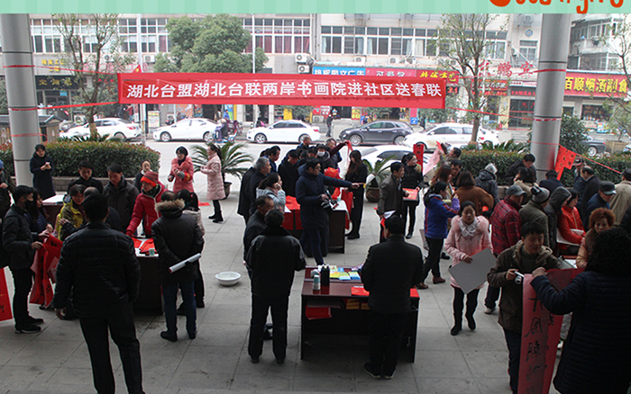 1月13日,在臺盟湖北省委、省臺聯(lián)協(xié)助下,臺盟中央兩岸書畫院湖北分院在武漢市武昌區(qū)首義社區(qū),舉行 “兩岸共迎新,送春聯(lián)進社區(qū)”活動。臺盟中央兩岸書畫院湖北分院院長、省臺盟原專職副主委、省書法協(xié)會副主席張?zhí)旃?,省臺盟原專職副主委、省炎黃文化研究會書畫院院長陳良才,湖北經(jīng)濟學院臺灣老師周明聰?shù)?,為在漢臺灣教師、臺生以及社區(qū)居民近兩百人寫春聯(lián)送福。