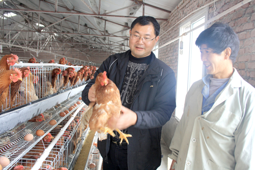 5月13日,竹山縣政協(xié)委員、城關(guān)鎮(zhèn)橋兒溝村農(nóng)民張洪武(左)正在新建的5萬(wàn)只養(yǎng)雞示范場(chǎng)里收獲成品雞蛋。