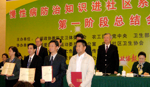 10月23日至25日,由全國(guó)政協(xié)教科文衛(wèi)體委員會(huì)、農(nóng)工黨中央、衛(wèi)生部、民政部、國(guó)家中醫(yī)藥管理局共同主辦的“慢性病防治知識(shí)進(jìn)社區(qū)系列宣傳活動(dòng)”第一階段總結(jié)會(huì)在北京召開,全國(guó)政協(xié)副主席陳宗興,全國(guó)政協(xié)教科文衛(wèi)體委員會(huì)副主任張文康,全國(guó)政協(xié)副秘書長(zhǎng)蔣作君及有關(guān)部委負(fù)責(zé)同志出席了會(huì)議。我委專職副主任葉澤林作大會(huì)發(fā)言,介紹了協(xié)調(diào)組織啟動(dòng)全國(guó)首先開展“慢性病防治知識(shí)進(jìn)社區(qū)系列宣傳活動(dòng)”的工作經(jīng)驗(yàn)。我省政協(xié)教科文衛(wèi)體委員會(huì)榮獲了組委會(huì)頒發(fā)的“慢性病防治知識(shí)進(jìn)社區(qū)系列宣傳活動(dòng)”組織獎(jiǎng)。